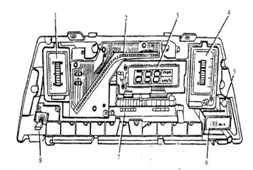 圖3數字式車速表1燃油表;2轉速表;3車速表;+溫度表;5蜂鳴器;6車速報警燈;7車速傳感器;8放大顯示開關