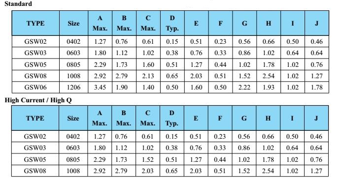 四、高頻繞線電感器封裝尺寸列表 (UNIT:mm